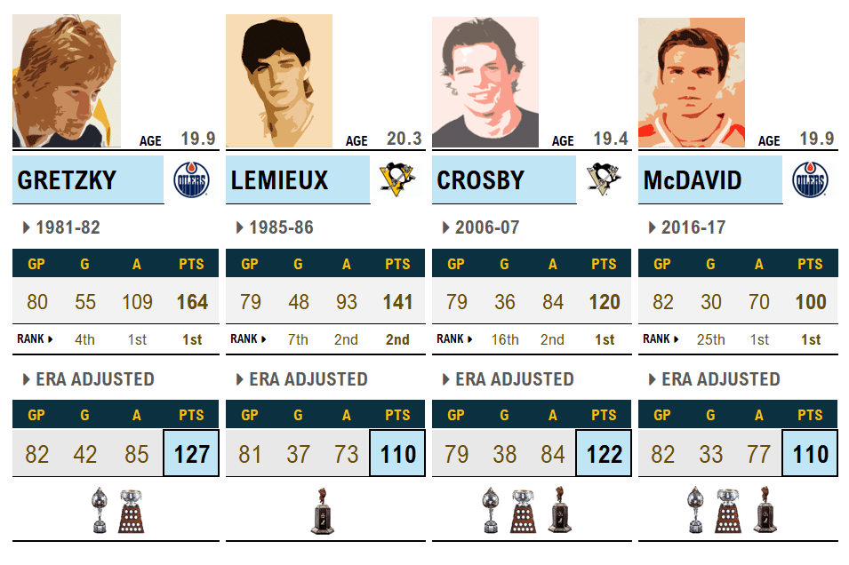 McDavid (#4) bested Crosby for the Hart in 2016-17, winning the scoring title by 11 points.