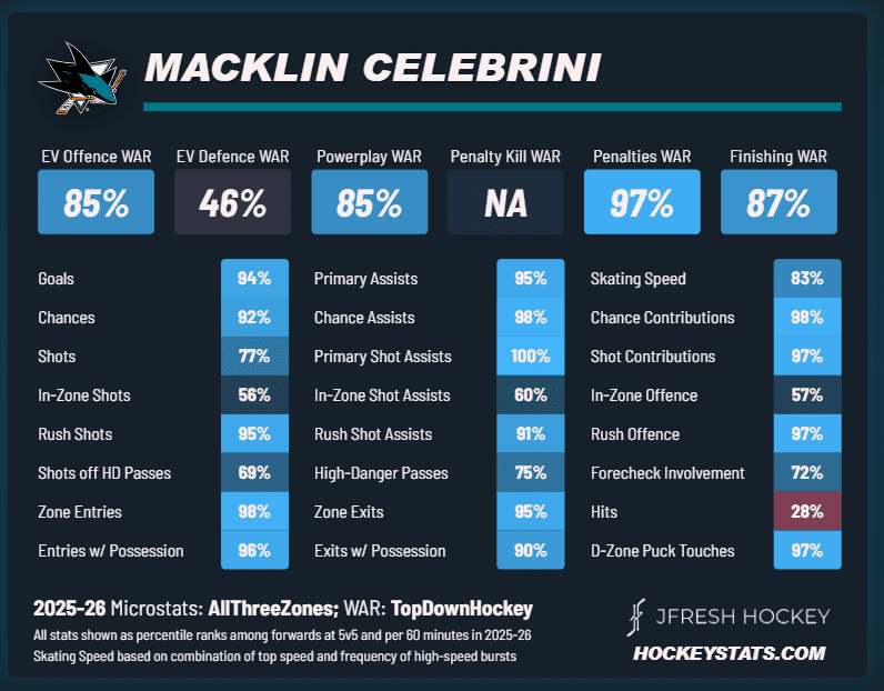 • At a macro level: Celebrini is elite at generating offense at even-strength (85%), creating power play scoring chances (85%), drawing penalties (97%), and finishing scoring chances (87%).