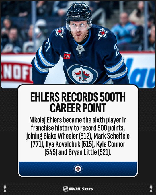 Ehlers also became the sixth player in franchise history to hit the 500-point mark, joining Blake Wheeler, Mark Scheifele, Ilya Kkovalchuk, Kyle Connor and Bryan Little.
