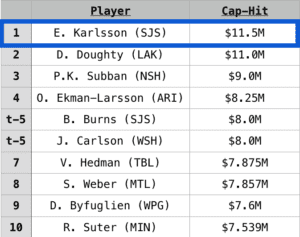 It also represents 13.9 percent of the Sharks’ cap-space (per PuckPedia.com).