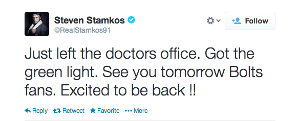 Steven Stamkos met with doctors on Wednesday and was given medical clearance to play on Thursday against the Sabres.