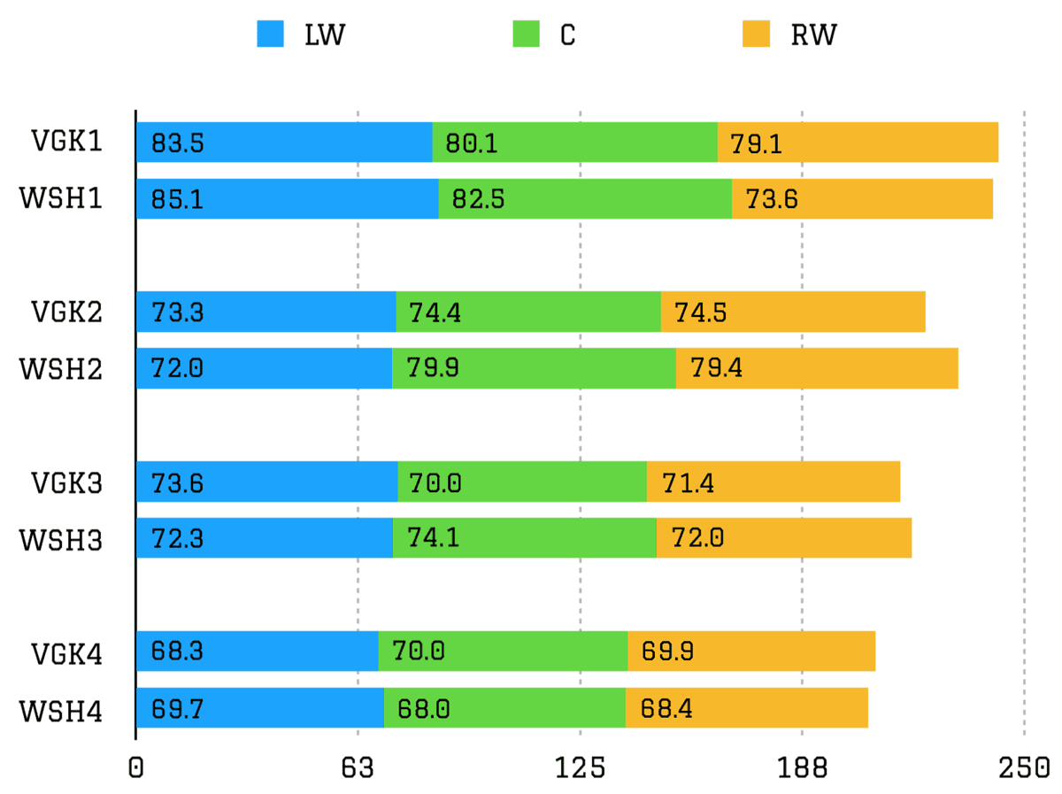 Based on the Corsica Player Ratings on our Line Combination Pages, the Golden Knights have the advantage on the first and fourth lines, but the Capitals’ second and third lines have an advantage. Up front, it should be an extremely competitive series–both teams look to be built very similarly.