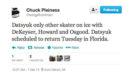 Nov. 4, 12:10 p.m – Datsyuk said he is symptom-free now and just needs a few practices to get into game shape. – Per Ansar Khan (@AnsarKhanMLive)